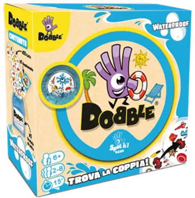 Grazie alle carte impermeabili e all'attrezzatura per le vacanze, ora potete portare il vostro Dobble a fare il bagno. Trovate il simbolo in comune tra due carte.