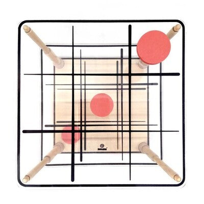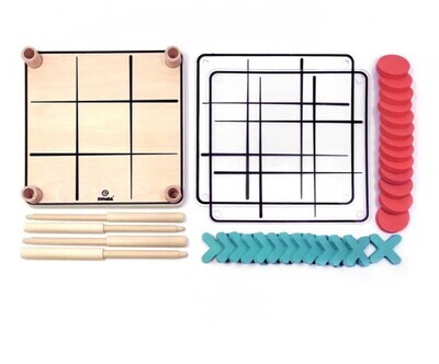 Il classico gioco del Tic Tac Toe entra in un'altra dimensione. Anzi, raggiunge l'epico numero di 3 dimensioni! Potete giocare su un solo livello, come siete abituati a fare, oppure passare a un altro livello ed estendere la sfida a 3 livelli! Posizionate 3 pezzi in fila, in orizzontale, in verticale e in diagonale sulla griglia! Il gioco comprende: 1 base in legno, 13 pezzi rossi "O" e 13 pezzi blu "X", 2 tavole in acrilico, 4 aste in legno.