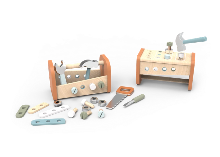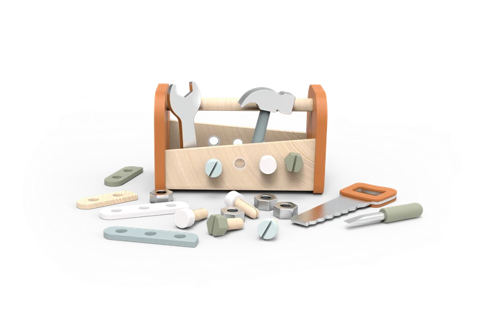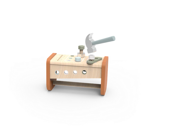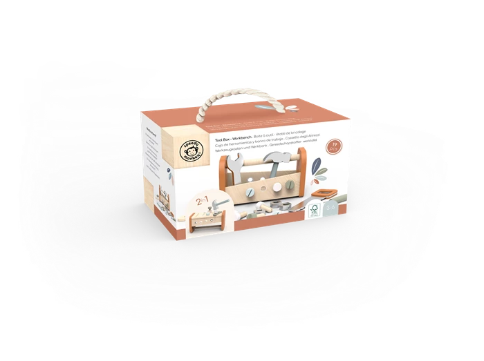 Questo giocattolo è sia un banco da lavoro che una cassetta degli attrezzi. Contiene tutto ciò che fa battere forte il cuore dei piccoli artigiani dai 3 anni in su, dai martelli alle seghe ai chiodi. Questo giocattolo è realizzato in legno proveniente da foreste certificate FSC.