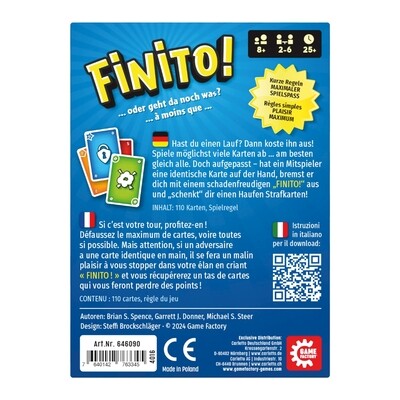 Scartate il maggior numero possibile di carte, se non tutte. Ma attenzione, se un avversario ha in mano una carta identica, si divertirà a fermarvi gridando Finito! e voi raccoglierete un mucchio di carte che vi costerà dei punti!
