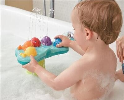 Rendi magico il momento del bagnetto con questa meravigliosa fontana musicale delle balene! Scegli se guardare le fontane danzare al suono della musica oppure suonare ciascuna balena come i tasti di un pianoforte! Attaccala semplicemente sul fondo della vasca con la ventosa in dotazione.