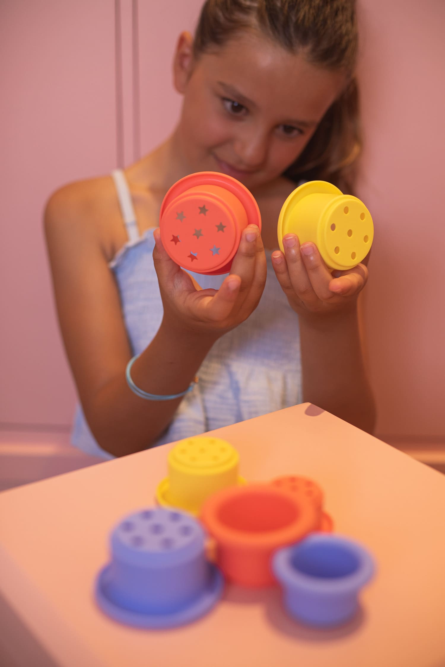 I bambini possono costruire una torre, creare forme, impilarle, ordinarle dalla più piccola alla più grande o per colore, usarle come utensili da cucina durante il gioco simbolico, come contenitori per passare oggetti da una tazza all'altra, nella vasca da bagno o in molti altri modi.