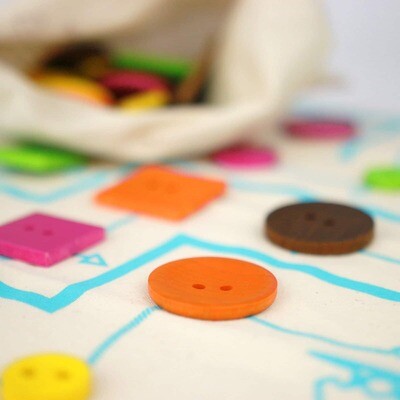 Un gioco da tavolo composto da un telo con un labirinto e un sacchetto con 45 bottoni in legno uno diverso dall’altro. I giocatori avanzano posizionando un bottone dopo l’altro, se ha la stessa forma o lo stesso colore o la stessa dimensione del precedente. un esercizio tattile, un gioco di associazione e una sfida divertente per tutta la famiglia, che può essere utilizzato anche dai più piccoli nelle versioni semplificate!