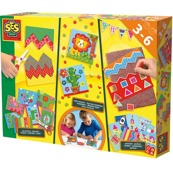 Imparate a tagliare, mosaicare e punzonare con questo allegro set artigianale della SES. Tagliate strisce colorate, bucherellate figure complete e mosaicate le piccole figure sulle immagini riconoscibili. Con questo set è possibile sviluppare tutte le abilità di base in modo giocoso. Il set contiene numerose stampe e immagini, un tappetino per punzonare e una penna per punzonare, forbici e adesivi per mosaico.