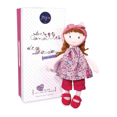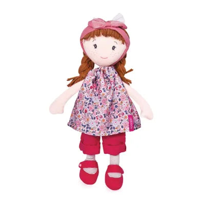 Bambola grande e morbida con pantaloni, camicetta e fascia rosa. Facile da togliere e da acconciare con i suoi capelli castani.