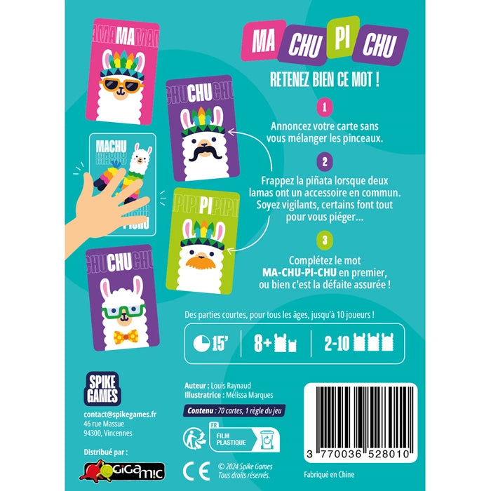 Ces lamas vont vous rendre fous! Machu Pichu est un jeu d’ambiance rapide et délirant qui mettra vos réflexes et votre observation à rude épreuve ! Tentez de vous débarrasser de toutes vos cartes en repérant les lamas avec un accessoire en commun. Un lama avec un poncho et des plumes sur la tête ? Oui, dans Machu Pichu, ça existe! Mais ce n'est pas tout ! Lorsque vous retournez une carte, annoncez le mot écrit dessus. Si une séquence MA-CHU-PI se forme, frappez immédiatement la piñata en criant "CHU" pour terminer le mot. Le dernier récupère toutes les cartes des autres.