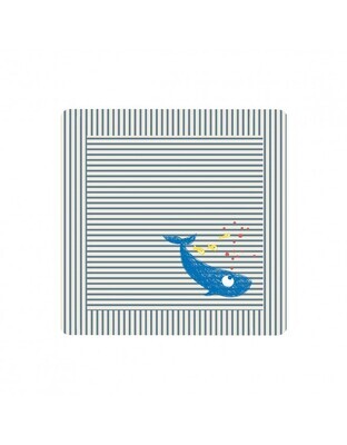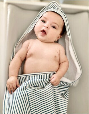 Mantello da bagno in 100% cotone bio certificato GOTS con sottili strisce color crema e blu.