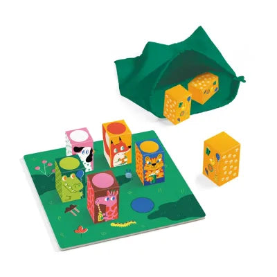 Gioco di associazione di suoni e di memoria. Gli animali sono irrequieti! Ritrova le coppie sonore e associa un cubo-mistero all'animale corrispondente.