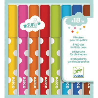 8 pennarelli per bimbi piccoli. Super-lavabili, mine molto resistenti, dai colori vivaci. Studiati appositamente per i più piccini.