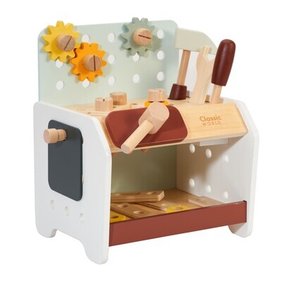 Questo piccolo banco da lavoro è dotato di tutti gli accessori necessari per far lavorare il vostro piccolo tuttofare. Il set comprende una chiave inglese, un martello, un cacciavite, alcuni ingranaggi, una tavola, bulloni, viti e parti in legno. Questo giocattolo aiuterà il bambino a migliorare la capacità di risolvere i problemi e la motricità fine.
