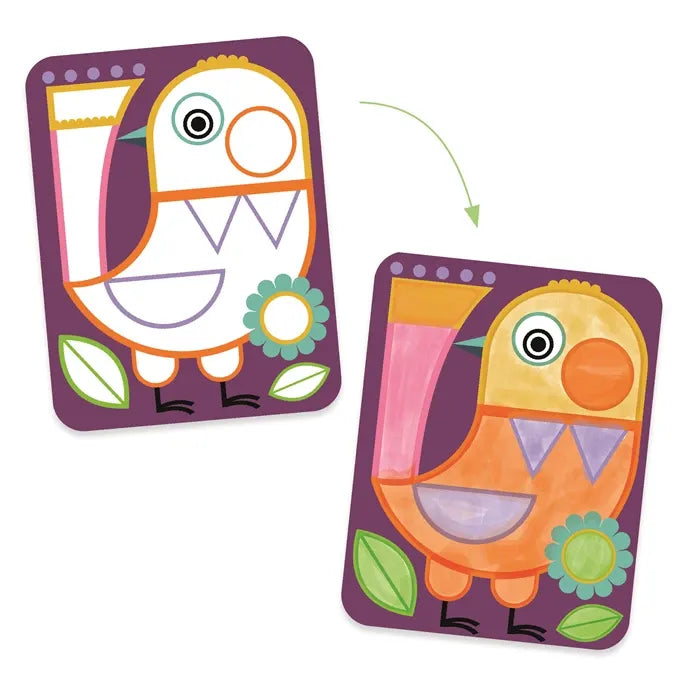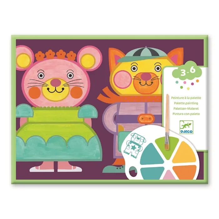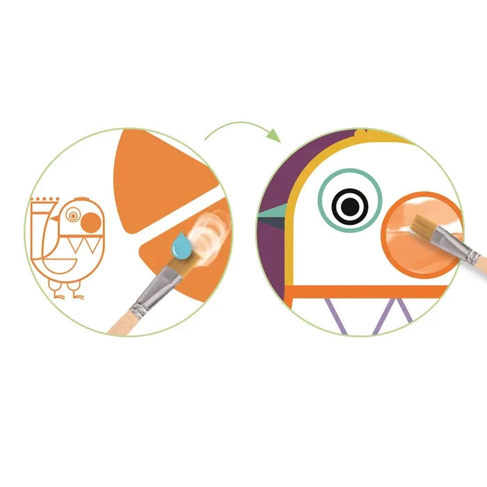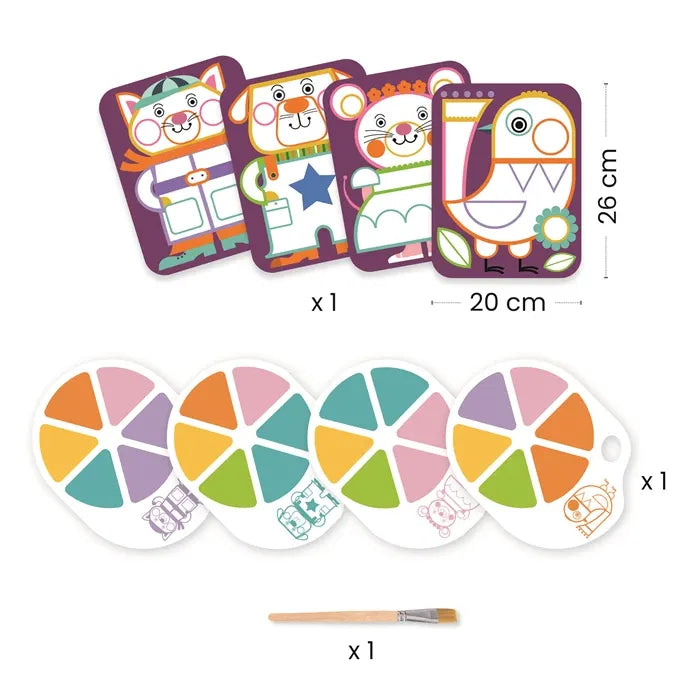 Il set comprende 4 tavole per dipingere, 4 tavolozze con inchiostro stampato, un pennello con manico in legno e un libretto esplicativo che guida i bambini in ogni fase.