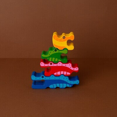 Puzzle di legno con quattro piccoli coccodrilli dai colori vivaci e un vassoio di legno. Questo giocattolo aiuta a promuovere la coordinazione occhio-mano.