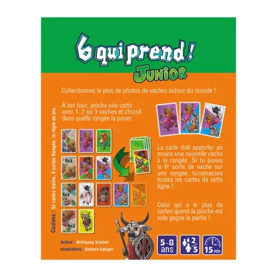 Dans 6 qui prend Juinor, collectez le plus de cartes Vaches autour du monde! Posez vos cartes Vache dans une rangée, mais en ajoutant au moins une nouvelle sorte de vache à la ligne, et si vous posez la 6e vache différente, vous ramassez cette rangée! Celui qui a le plus de cartes remporte la partie!