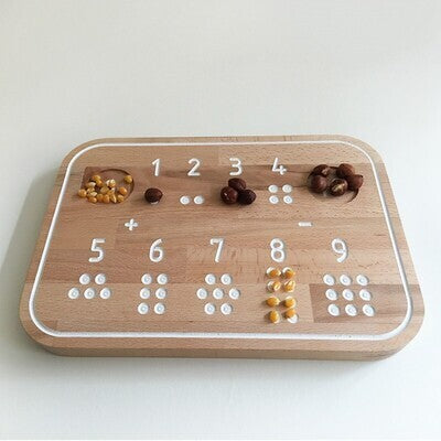 I numeri da 0 a 10 e semplici simboli matematici come l'addizione e la sottrazione sono incise su questa tabella, adattata all'educazione Montessori o Waldorf.