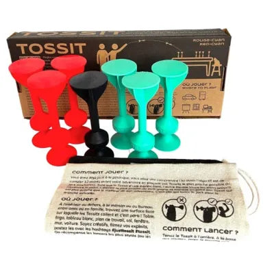 TOSSIT è un gioco di abilità che è un mix tra bocce e freccette e può essere giocato all'interno o all'esterno, a terra o in verticale. Si può giocare su qualsiasi superficie liscia intorno a voi, al chiuso o all'aperto! Tavolo, pavimento, soffitto, finestra, auto... Il set TOSSIT originale di cui avete bisogno per iniziare a divertirvi con gli amici, la famiglia, la sera o anche in ufficio tra due pause!
