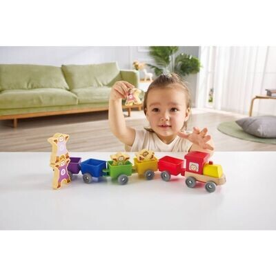 - Il trenino include una locomotiva, cinque scompartimenti di colori diversi e 10 scimmie di legno colorate.