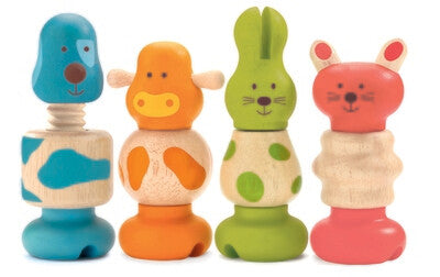 Il tuo bambino si divertirà ad avvitare e svitare i corpi e le gambe di questi divertenti animali: coniglio, cane, gatto e mucca. Allora si divertirà a mescolarli!