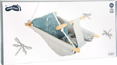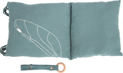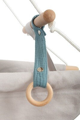 La part importante et visible de bois massif, les matériaux naturels et la couleur tendance bleu fumé font de ce hamac bébé un accroche-regard absolu ! Exactement ce qu'il faut pour des bébés détendus et satisfaits ! Les bois arrondis assurent, grâce à leur forme douce, un toucher agréable et une grande sécurité. Le coussin amovible est fixé à la balancelle par des boucles. Un bouton-pression sécurise l'anneau de préhension/de dentition - d'autres accessoires comme les tétines et les jouets peuvent être fixés en plus.