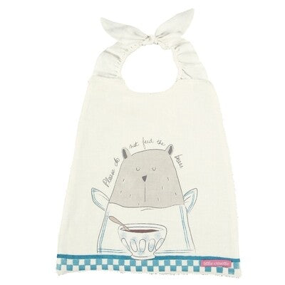 Grand bavoir façon serviette de table, en lin doublée d'éponge, pour protéger bébé lors de ses premiers repas solides. Noeud factice au dos.