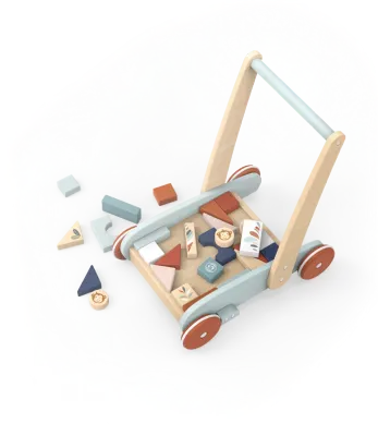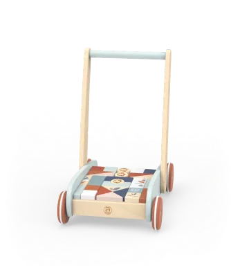 Ce chariot de marche accompagne les jeunes enfants dans leurs premiers pas et les aide à se tenir debout et à marcher. Les 27 cubes colorés fournis servent de poids pour le chariot lorsque le bébé le pousse. La stabilité et l'équilibre sont ainsi stimulés de manière optimale. Pour la sécurité de l'enfant, le chariot de marche est équipé d'un système de freinage. Ce jouet est fabriqué à partir de bois issu d'une exploitation durable de forêts certifiées FSC. Présenté dans une belle boîte cadeau.
