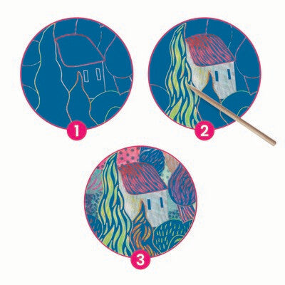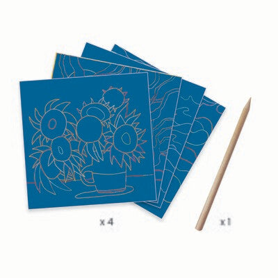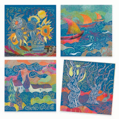 S'inspirant du style de Vincent Van Gogh, Muriel Kerba propose de reproduire des motifs en grattant la surface de ces quatres cartes et ainsi dévoiler les illustrations.