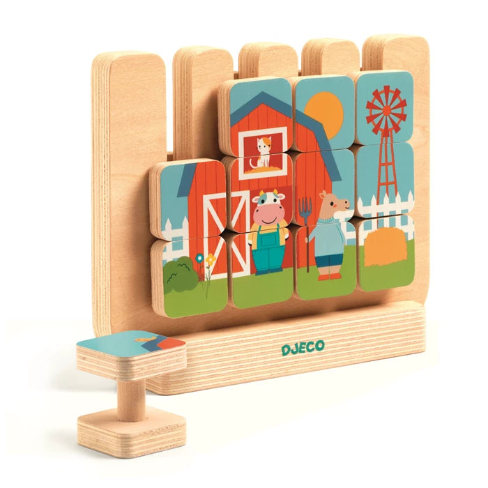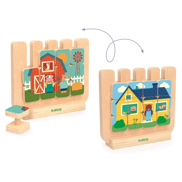 L’enfant choisit un des deux modèles, sélectionne les bonnes pièces en bois et les glisse dans le support pour recréer avec précision la séquence colorée de la carte choisie. Mais attention, la tâche n'est pas aussi simple qu'elle en a l'air! Les pièces en bois présentent des images légèrement différentes au recto et au verso, ce qui ajoute une dimension supplémentaire au défi.