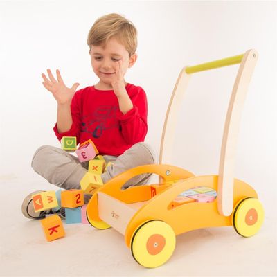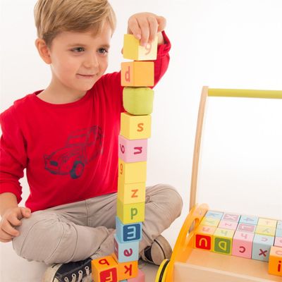 Le chariot aux cubes aide l'enfant à apprendre à marcher. En outre, il commence à se familiariser avec les chiffres et les lettres en jouant avec ses parents.