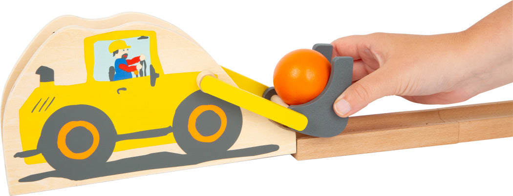 Attention aux fans des circuits à boules ! Les éléments de construction de ce circuit à boules "Junior" sont très faciles à assembler et voilà, les boules extra larges commencent à rouler sur le chantier !