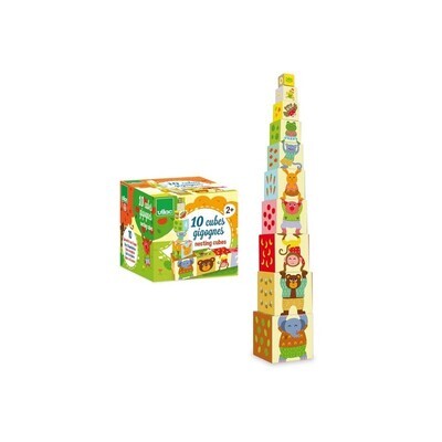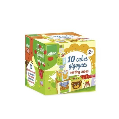 Dix cubes illustrés en carton, que l'on peut assembler en longueur ou en hauteur.