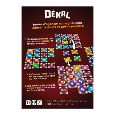 Dans Dékal, agencez au mieux votre grille de cartes afin d'obtenir le moins de points possible. À chaque tour, jouez une carte puis reformez un carré parfait en poussant une ligne ou une colonne. En fin de partie, les cartes adjacentes de même valeur s'annulent, ce qui permet de marquer moins de points.