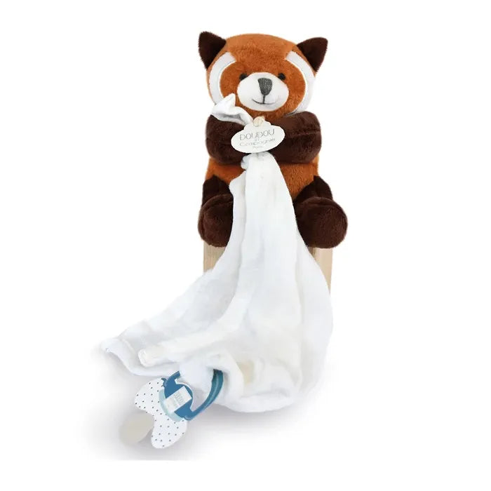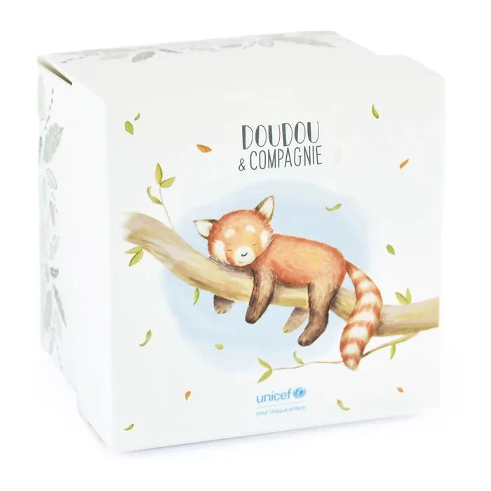 Ce panda en peluche tient un mouchoir en coton tout doux, très pratique pour ne pas perdre sa tétine. Il est présenté dans une boîte cadeau à l'élégant motif végétal, une boîte si bien illustrée qu'elle sera conservée et recyclée par tous. C'est un cadeau de naissance idéal.