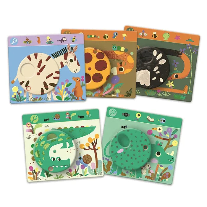 Un jeu d'observation tactile et interactif sur le thème des animaux, avec un lion, une tortue, une girafe...