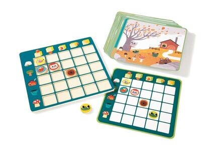 Contient : un plateau en bois, 20 cartes de défi avec les solutions au dos et 5 jetons en bois.