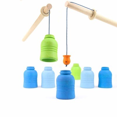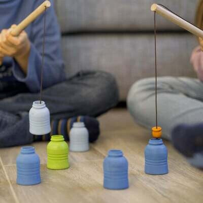 Choisissez votre niveau de difficulté en ajustant la longueur de la ligne. Accrochez la bouteille avec le poisson en bois et soulevez-la en faisant glisser l'anneau sur la tige, puis relâchez-la sans la toucher avec les mains. Le joueur qui réussit à attraper le plus de bouteilles en bois avant son adversaire gagne !