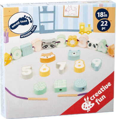Jeu à enfiler amusant avec des animaux et des chiffres ! Le but de ce jeu d'enfilage en bois est d'enfiler les chiffres de 0 à 9 dans le bon ordre. Concentration et habileté sont requises de la part des petits artisans! Différents animaux et formes au look pastel moderne peuvent être enfilés à volonté.