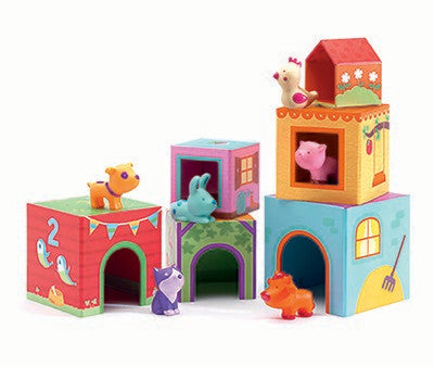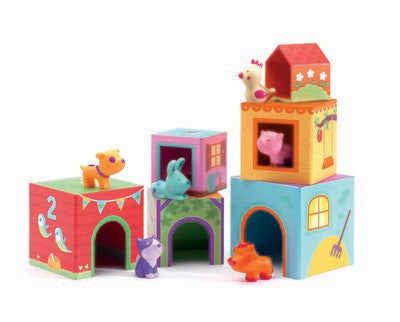 Djeco rassemble sur ce jeux des figurines d'animaux en plastique souple et des cubes à empiler qui font office de maison pour les animaux. L'enfant pourra ainsi jouer simplement avec les cubes à empiler, il pourra associer les animaux et les cubes, apprendre les couleurs, les nombres, les formes, et inventer des histoires avec tout ce beau monde. Bref un jeu très ludique et très complet.