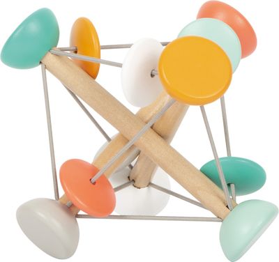 Trois baguettes de bois associées par des élastiques peuvent être tournées et tirées dans tous les sens. Voici un défi sportif pour les petites mains. Les éléments colorés coulissants claquètent lorsqu´on les secoue.
