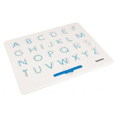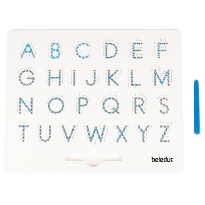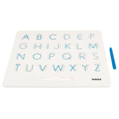 Tablette ludique pour apprendre à écrire les lettres majuscules. On passe la pointe du stylo sur les lettres et si on est bien au-dessus du tracé de la lettre, les petites billes en fer remontent en surface et remplissent les trous des lettres. Des petites flèches indiquent le sens dans lequel l'enfant doit tracer ses lettres. Pour pouvoir recommencer on passe la main ou le crayon couché sur les lettres et les billes rentrent dans la tablette. C'est magique, très motivant et très utile pour apprendre à tenir un crayon et à tracer les lettres!