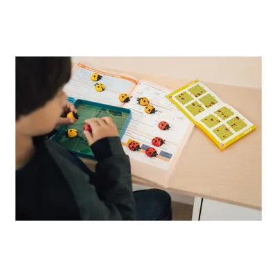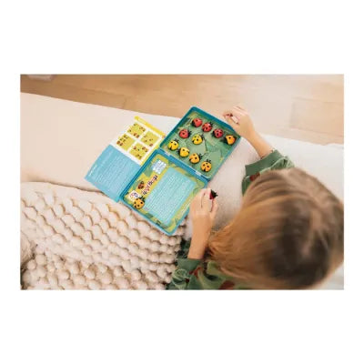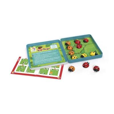 «Logibugs» est un jeu magnétique de déduction dans lequel vous devrez trouver où poser vos coccinelles sur les feuilles de l’arbre. L’ordre prescrit tient compte de la couleur des trois familles et des valeurs numériques de chaque coccinelle représentées par le nombre de points sur leur dos.