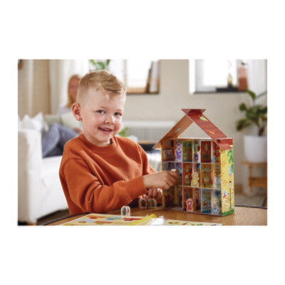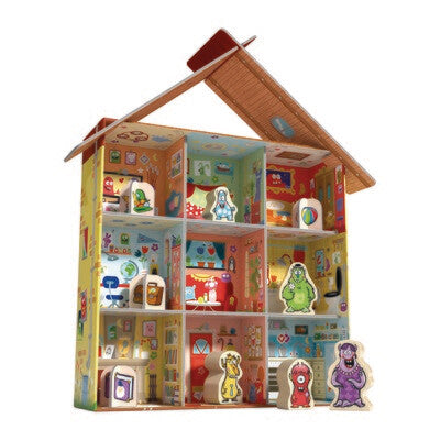 1 maison (= fond de la boîte illustré), 1 ensemble de murs et planchers (en 4 parties qui s’emboîtent), 1 toit (en 2 parties), 5 monstres, 4 objets fétiches, 1 livret avec 60 missions et solutions, 1 règle du jeu.