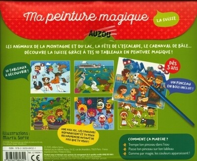 Les animaux de la montagne et du lac, la fête de l'Escalade, le carnaval de Bâle... Découvre la Suisse grâce à tes 10 tableaux en peinture magique !Une technique facile pour les petits, avec une garantie de résultat. De magnifiques illustrations de Jane Marta Sorte