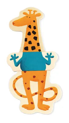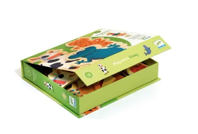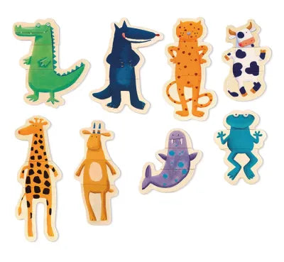 Le coffret contient 24 pièces magnétiques en bois permettant de créer 8 animaux de 3 pièces chacun. Votre enfant s'amusera à associer la tête, le corps et les pattes de chaque animal : une vache, un crocodile, une girafe, une grenouille, un loup...