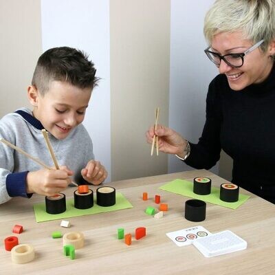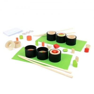 COMPOSANTS : 8 ingrédients en bois coloré (100% FSC®) pour composer 6 makis, 2 sets de table en feutre vert, 2 paires de baguettes en bambou, 33 cartes avec compositions de recettes et instructions. Tous les ingrédients sont en bois (100% FSC®).