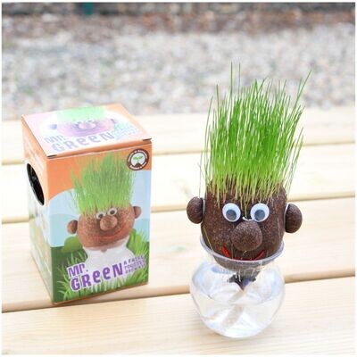 Mr Green n'a plus de cheveux ! Aidons-le à lui en faire pousser de nouveau. Les graines de gazon disposées sur la tête, poussent en quelques jours et l'enfant pourra lui couper les cheveux. La ficelle sert à une remontée d'eau par capillarité. Il te suffit de refaire le niveau d'eau régulièrement.