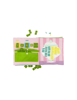 Les pages 5 et 6 de ce livre d’éveil développent l’esprit logique de l’enfant par les mathématiques. La page 5 est composée d’une pochette où sont rangés les chiffres ainsi que les signes de l’addition et de la soustraction qu’il peut placer sur des supports en velcro afin de réaliser ses propres opérations mathématiques. Juste à côté de cette page se trouve une activité en forme de jarre à bonbons de deux couleurs différentes permettant à l’enfant de répondre aux opérations de la page précédente.