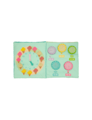 En page 4, un jeu d’éveil apprend à l’enfant à reconnaître les heures clé de la journée, comme l’heure du réveil à 8h05 et l’heure du déjeuner à 12h. Ainsi, il apprend à associer le placement des aiguilles d’une horloge à l’heure en format digital en plaçant chaque horloge au bon endroit.