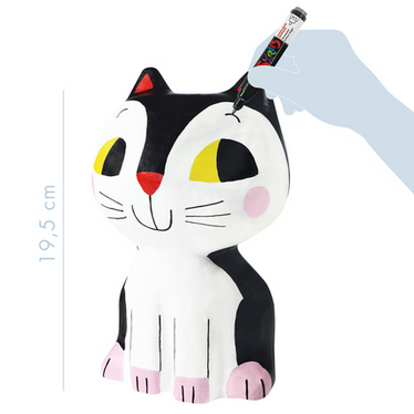 Comprend : 1 animal en papier mâché de 12,5x10,5x19 cm, 4 marqueurs Pébéo, 3 feuilles pré-dessinées de 14x14 cm et des instructions.