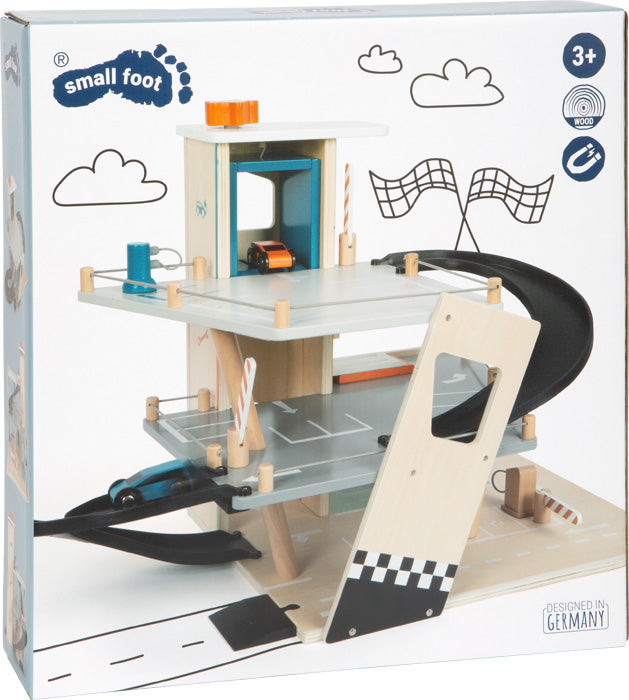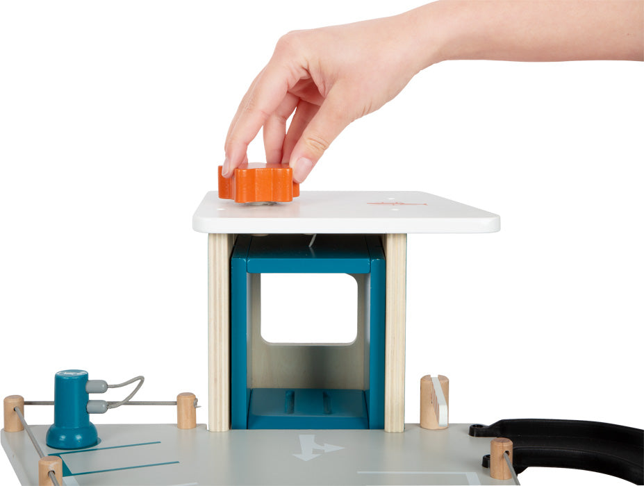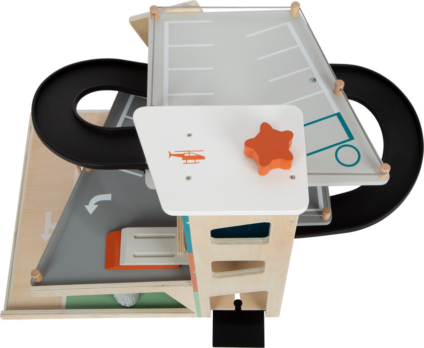 Ici, tout va très vite ! Gare-toi, fais le plein, lave-toi, répare - puis dévale les rampes du parking à la vitesse d'une flèche ! La surface mate des rampes donne un aspect authentique d'asphalte. Les deux voitures fournies peuvent être garées sur trois niveaux dans le garage, lorsqu'elles ne sont pas en train de faire le plein à la pompe à essence magnétique ou à la borne de recharge électrique. Dans l'atelier de réparation automobile avec pont élévateur réglable en hauteur, tout est vérifié une dernière fois avant que les petits bolides ne passent par la station de lavage aux rouleaux mobiles ! L'ascenseur entre les niveaux du parking est actionné par un grand volant - un mécanisme de blocage et des rainures au sol permettent aux voitures de monter en toute sécurité. La limite flexible en caoutchouc convient comme catapulte pour les voitures. Avec une piste d'atterrissage pour hélicoptère sur le toit de l'ascenseur !