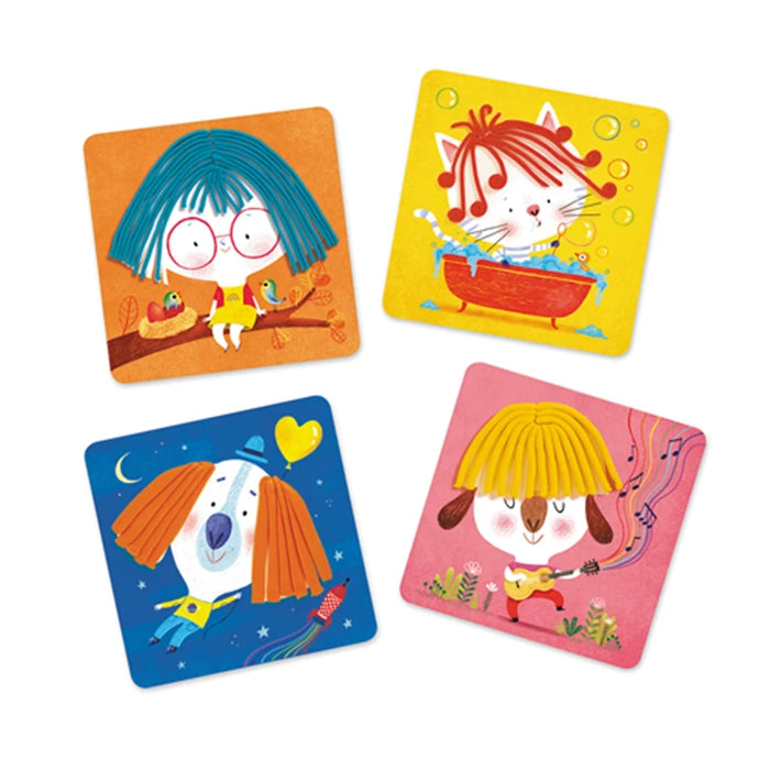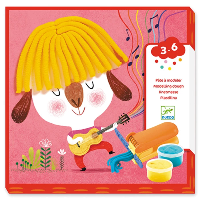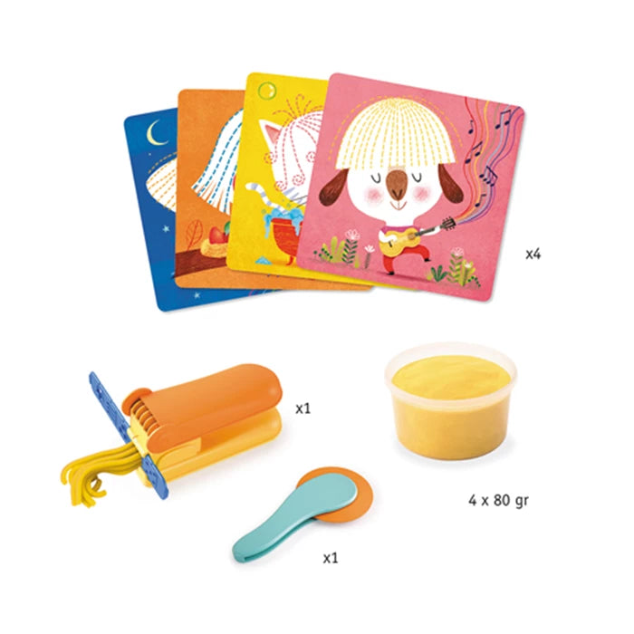 4 pots de 80gr de pâte à modeler- 4 planches illustrées en plastique à décorer, 1 presse, et 2 barrettes pour faire des cheveux- 1 roulette pour couper les cheveux