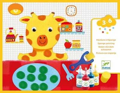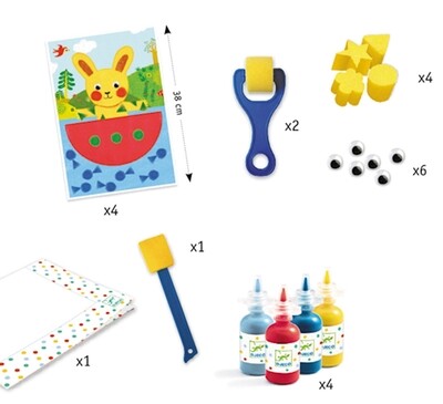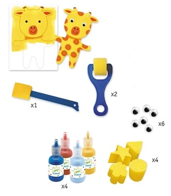 Dessiner, oui, mais autrement! L'éponge permet de créer de premières petites œuvres d'art. Il suffit de mélanger les couleurs dans le petit pot et de les appliquer ensuite avec le rouleau mousse ou les petites éponges. Cela ne fait rien si l'enfant déborde un peu car les dessins peuvent être séparés de la feuille et collés sur l'affiche incluse.